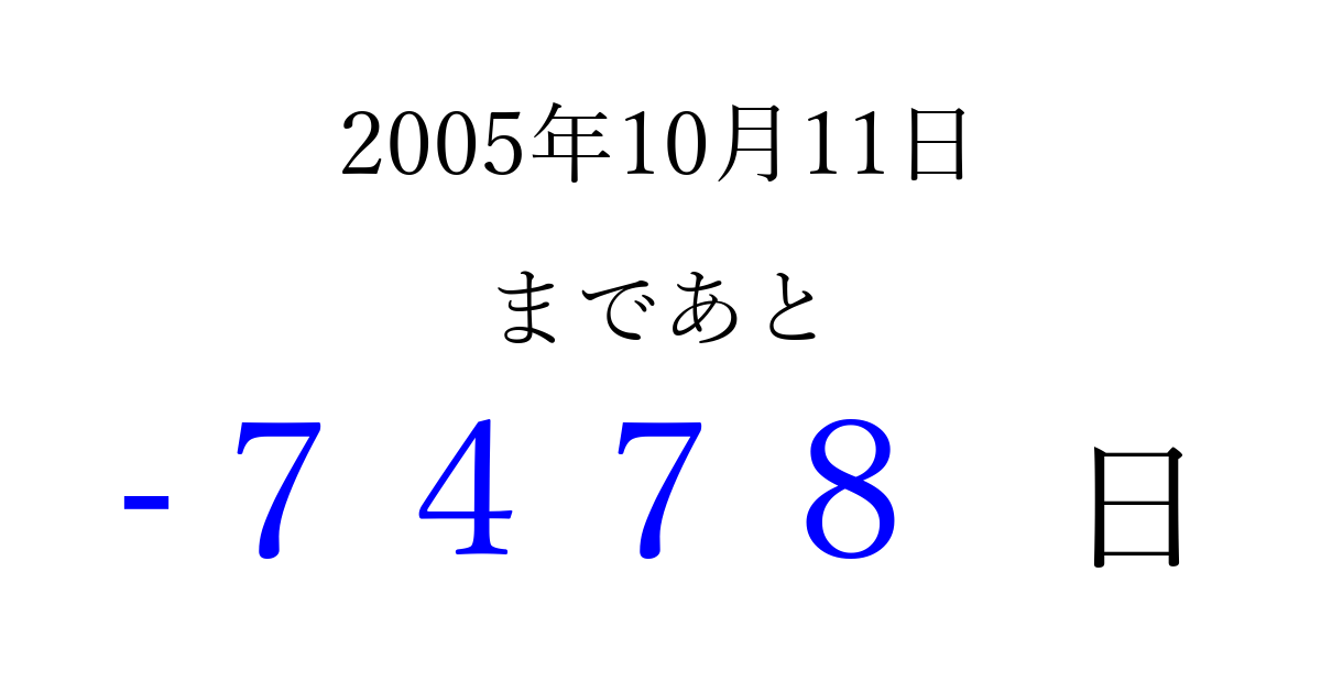 2005年10月11日(火)は もう 0000 日過ぎました 追加すると、トップページからすぐ選べるようになります ※2026/04/02現在の結果です。 最新の状態に更新する ↓シェアして、タイムライン上にカウントダウンを表示しよう!↓ 📤 この結果を共有する Tweet シェア Threads Bluesky 別の日付でカウントダウン 2005年10月のカレンダー このページをブックマークに追加すると、いつでもカウントダウンを確認できます。 (PC: Ctrl+D / Mac: ⌘+D) hitome-notes.comでは以下のページも運営しています。 指定日と期間から日付を計算 | ガチャ確率計算・シミュレーション | プライバシー・ポリシー 運営者:Avocado