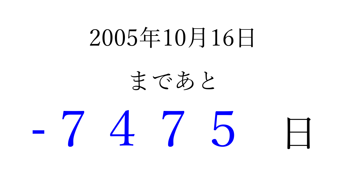 2005年10月16日(日)は もう 0000 日過ぎました 追加すると、トップページからすぐ選べるようになります ※2026/04/04現在の結果です。 最新の状態に更新する ↓シェアして、タイムライン上にカウントダウンを表示しよう!↓ 📤 この結果を共有する Tweet シェア Threads Bluesky 別の日付でカウントダウン 2005年10月のカレンダー このページをブックマークに追加すると、いつでもカウントダウンを確認できます。 (PC: Ctrl+D / Mac: ⌘+D) hitome-notes.comでは以下のページも運営しています。 指定日と期間から日付を計算 | ガチャ確率計算・シミュレーション | プライバシー・ポリシー 運営者:Avocado
