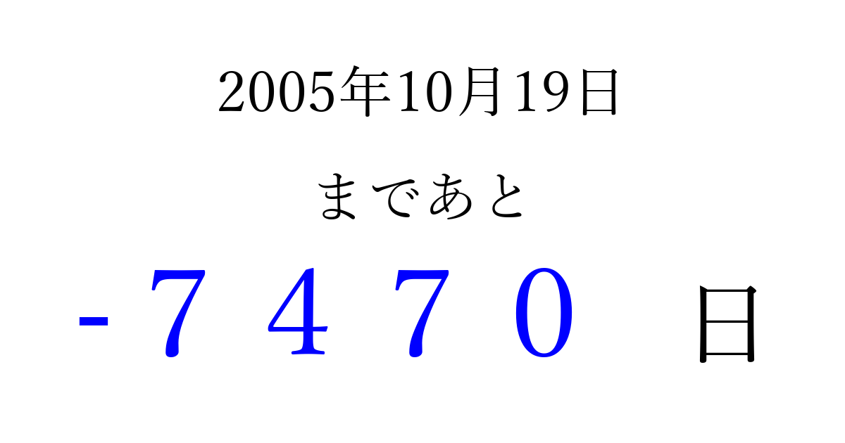 2005年10月19日(水)は もう 0000 日過ぎました 追加すると、トップページからすぐ選べるようになります ※2026/04/02現在の結果です。 最新の状態に更新する ↓シェアして、タイムライン上にカウントダウンを表示しよう!↓ 📤 この結果を共有する Tweet シェア Threads Bluesky 別の日付でカウントダウン 2005年10月のカレンダー このページをブックマークに追加すると、いつでもカウントダウンを確認できます。 (PC: Ctrl+D / Mac: ⌘+D) hitome-notes.comでは以下のページも運営しています。 指定日と期間から日付を計算 | ガチャ確率計算・シミュレーション | プライバシー・ポリシー 運営者:Avocado