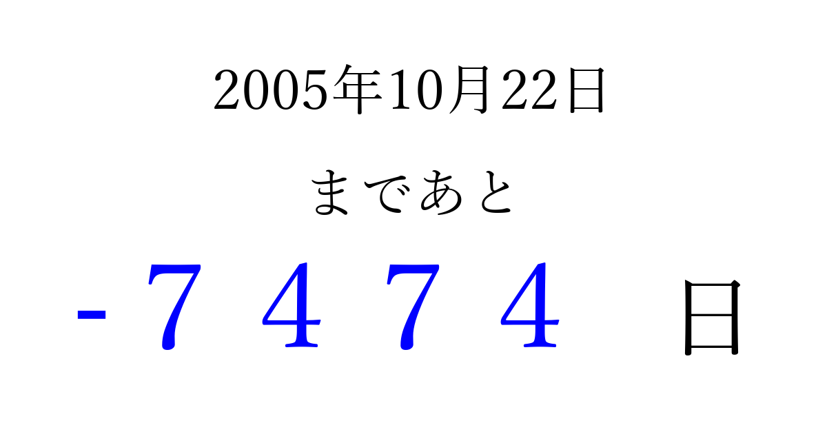 2005年10月22日(土)は もう 0000 日過ぎました 追加すると、トップページからすぐ選べるようになります ※2026/04/09現在の結果です。 最新の状態に更新する ↓シェアして、タイムライン上にカウントダウンを表示しよう!↓ 📤 この結果を共有する Tweet シェア Threads Bluesky 別の日付でカウントダウン 2005年10月のカレンダー このページをブックマークに追加すると、いつでもカウントダウンを確認できます。 (PC: Ctrl+D / Mac: ⌘+D) hitome-notes.comでは以下のページも運営しています。 指定日と期間から日付を計算 | ガチャ確率計算・シミュレーション | プライバシー・ポリシー 運営者:Avocado