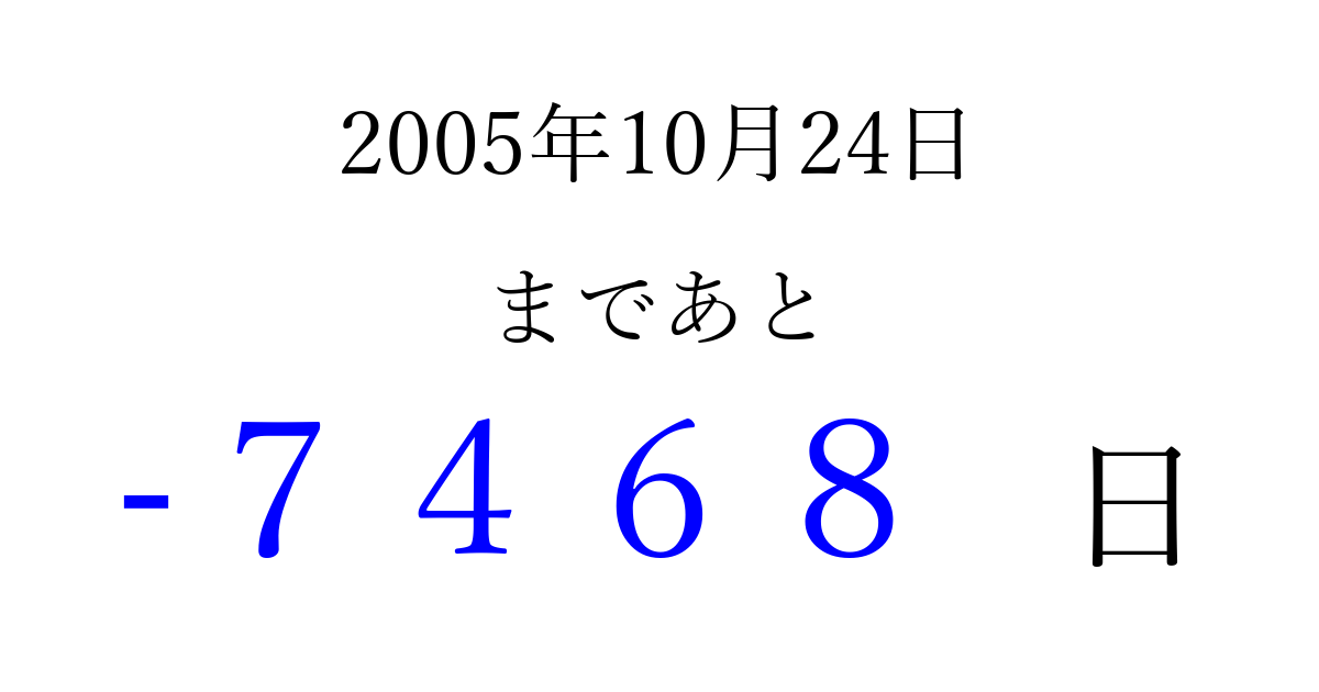 2005年10月24日(月)は もう 0000 日過ぎました 追加すると、トップページからすぐ選べるようになります ※2026/04/05現在の結果です。 最新の状態に更新する ↓シェアして、タイムライン上にカウントダウンを表示しよう!↓ 📤 この結果を共有する Tweet シェア Threads Bluesky 別の日付でカウントダウン 2005年10月のカレンダー このページをブックマークに追加すると、いつでもカウントダウンを確認できます。 (PC: Ctrl+D / Mac: ⌘+D) hitome-notes.comでは以下のページも運営しています。 指定日と期間から日付を計算 | ガチャ確率計算・シミュレーション | プライバシー・ポリシー 運営者:Avocado