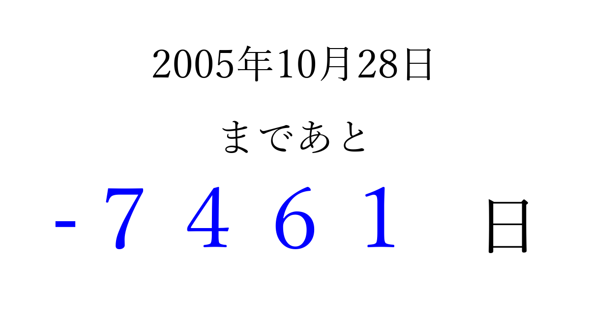 2005年10月28日(金)は もう 0000 日過ぎました 追加すると、トップページからすぐ選べるようになります ※2026/04/02現在の結果です。 最新の状態に更新する ↓シェアして、タイムライン上にカウントダウンを表示しよう!↓ 📤 この結果を共有する Tweet シェア Threads Bluesky 別の日付でカウントダウン 2005年10月のカレンダー このページをブックマークに追加すると、いつでもカウントダウンを確認できます。 (PC: Ctrl+D / Mac: ⌘+D) hitome-notes.comでは以下のページも運営しています。 指定日と期間から日付を計算 | ガチャ確率計算・シミュレーション | プライバシー・ポリシー 運営者:Avocado