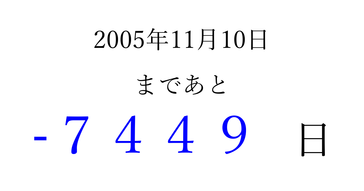 2005年11月10日(木)は もう 0000 日過ぎました 追加すると、トップページからすぐ選べるようになります ※2026/04/03現在の結果です。 最新の状態に更新する ↓シェアして、タイムライン上にカウントダウンを表示しよう!↓ 📤 この結果を共有する Tweet シェア Threads Bluesky 別の日付でカウントダウン 2005年11月のカレンダー このページをブックマークに追加すると、いつでもカウントダウンを確認できます。 (PC: Ctrl+D / Mac: ⌘+D) hitome-notes.comでは以下のページも運営しています。 指定日と期間から日付を計算 | ガチャ確率計算・シミュレーション | プライバシー・ポリシー 運営者:Avocado