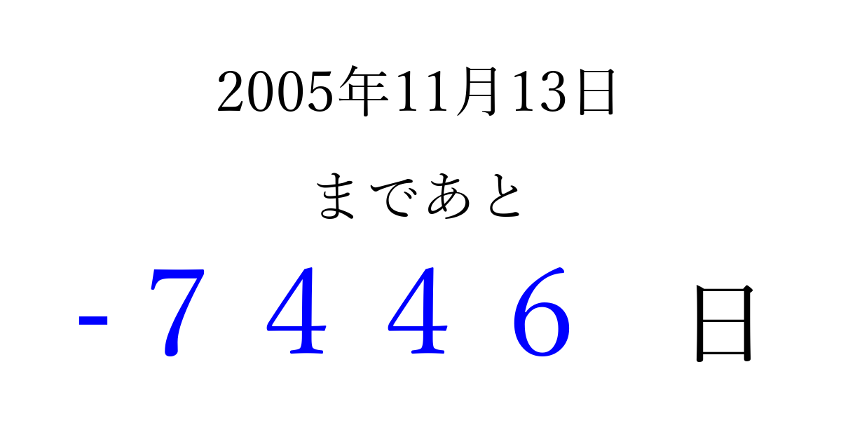 2005年11月13日(日)は もう 0000 日過ぎました 追加すると、トップページからすぐ選べるようになります ※2026/04/03現在の結果です。 最新の状態に更新する ↓シェアして、タイムライン上にカウントダウンを表示しよう!↓ 📤 この結果を共有する Tweet シェア Threads Bluesky 別の日付でカウントダウン 2005年11月のカレンダー このページをブックマークに追加すると、いつでもカウントダウンを確認できます。 (PC: Ctrl+D / Mac: ⌘+D) hitome-notes.comでは以下のページも運営しています。 指定日と期間から日付を計算 | ガチャ確率計算・シミュレーション | プライバシー・ポリシー 運営者:Avocado