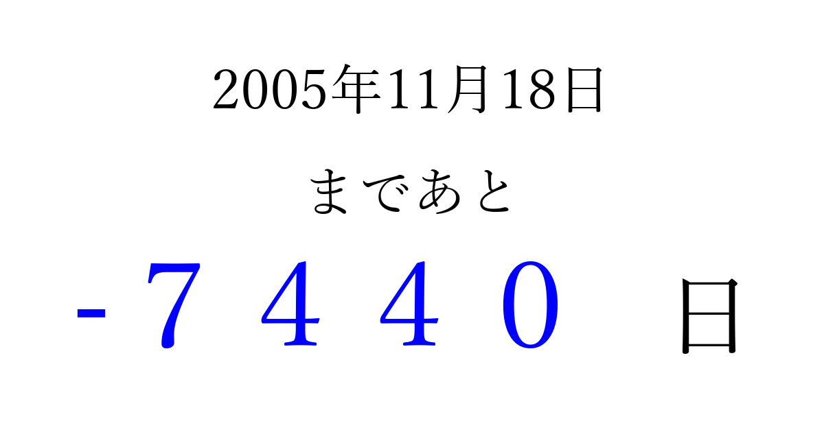 2005年11月18日(金)は もう 0000 日過ぎました 追加すると、トップページからすぐ選べるようになります ※2026/04/02現在の結果です。 最新の状態に更新する ↓シェアして、タイムライン上にカウントダウンを表示しよう!↓ 📤 この結果を共有する Tweet シェア Threads Bluesky 別の日付でカウントダウン 2005年11月のカレンダー このページをブックマークに追加すると、いつでもカウントダウンを確認できます。 (PC: Ctrl+D / Mac: ⌘+D) hitome-notes.comでは以下のページも運営しています。 指定日と期間から日付を計算 | ガチャ確率計算・シミュレーション | プライバシー・ポリシー 運営者:Avocado