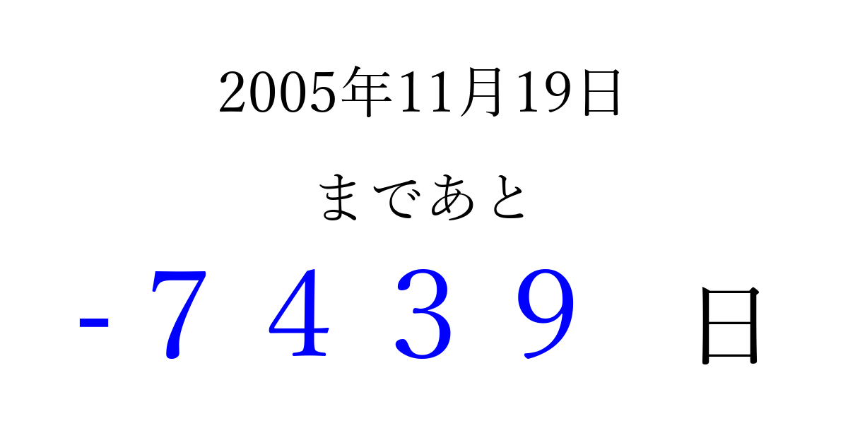 2005年11月19日(土)は もう 0000 日過ぎました 追加すると、トップページからすぐ選べるようになります ※2026/04/02現在の結果です。 最新の状態に更新する ↓シェアして、タイムライン上にカウントダウンを表示しよう!↓ 📤 この結果を共有する Tweet シェア Threads Bluesky 別の日付でカウントダウン 2005年11月のカレンダー このページをブックマークに追加すると、いつでもカウントダウンを確認できます。 (PC: Ctrl+D / Mac: ⌘+D) hitome-notes.comでは以下のページも運営しています。 指定日と期間から日付を計算 | ガチャ確率計算・シミュレーション | プライバシー・ポリシー 運営者:Avocado