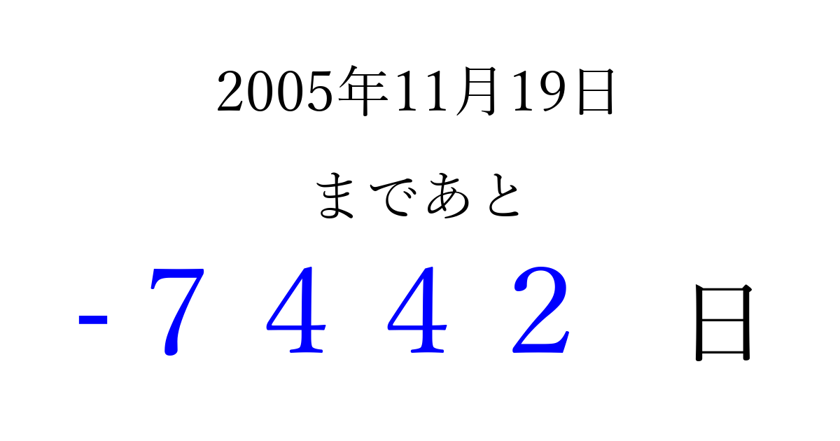 2005年11月19日(土)は もう 0000 日過ぎました 追加すると、トップページからすぐ選べるようになります ※2026/04/05現在の結果です。 最新の状態に更新する ↓シェアして、タイムライン上にカウントダウンを表示しよう!↓ 📤 この結果を共有する Tweet シェア Threads Bluesky 別の日付でカウントダウン 2005年11月のカレンダー このページをブックマークに追加すると、いつでもカウントダウンを確認できます。 (PC: Ctrl+D / Mac: ⌘+D) hitome-notes.comでは以下のページも運営しています。 指定日と期間から日付を計算 | ガチャ確率計算・シミュレーション | プライバシー・ポリシー 運営者:Avocado