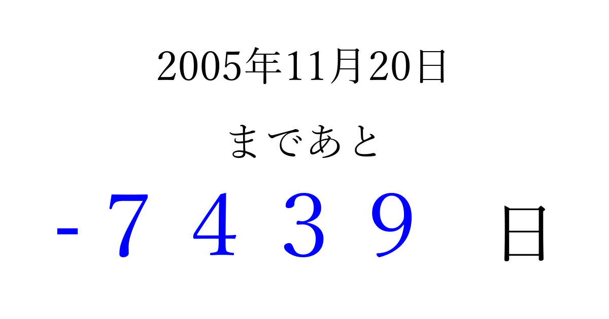 2005年11月20日(日)は もう 0000 日過ぎました 追加すると、トップページからすぐ選べるようになります ※2026/04/03現在の結果です。 最新の状態に更新する ↓シェアして、タイムライン上にカウントダウンを表示しよう!↓ 📤 この結果を共有する Tweet シェア Threads Bluesky 別の日付でカウントダウン 2005年11月のカレンダー このページをブックマークに追加すると、いつでもカウントダウンを確認できます。 (PC: Ctrl+D / Mac: ⌘+D) hitome-notes.comでは以下のページも運営しています。 指定日と期間から日付を計算 | ガチャ確率計算・シミュレーション | プライバシー・ポリシー 運営者:Avocado