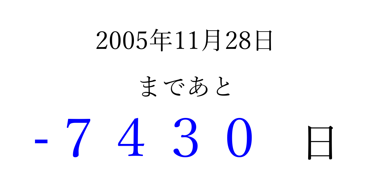 2005年11月28日(月)は もう 0000 日過ぎました 追加すると、トップページからすぐ選べるようになります ※2026/04/02現在の結果です。 最新の状態に更新する ↓シェアして、タイムライン上にカウントダウンを表示しよう!↓ 📤 この結果を共有する Tweet シェア Threads Bluesky 別の日付でカウントダウン 2005年11月のカレンダー このページをブックマークに追加すると、いつでもカウントダウンを確認できます。 (PC: Ctrl+D / Mac: ⌘+D) hitome-notes.comでは以下のページも運営しています。 指定日と期間から日付を計算 | ガチャ確率計算・シミュレーション | プライバシー・ポリシー 運営者:Avocado