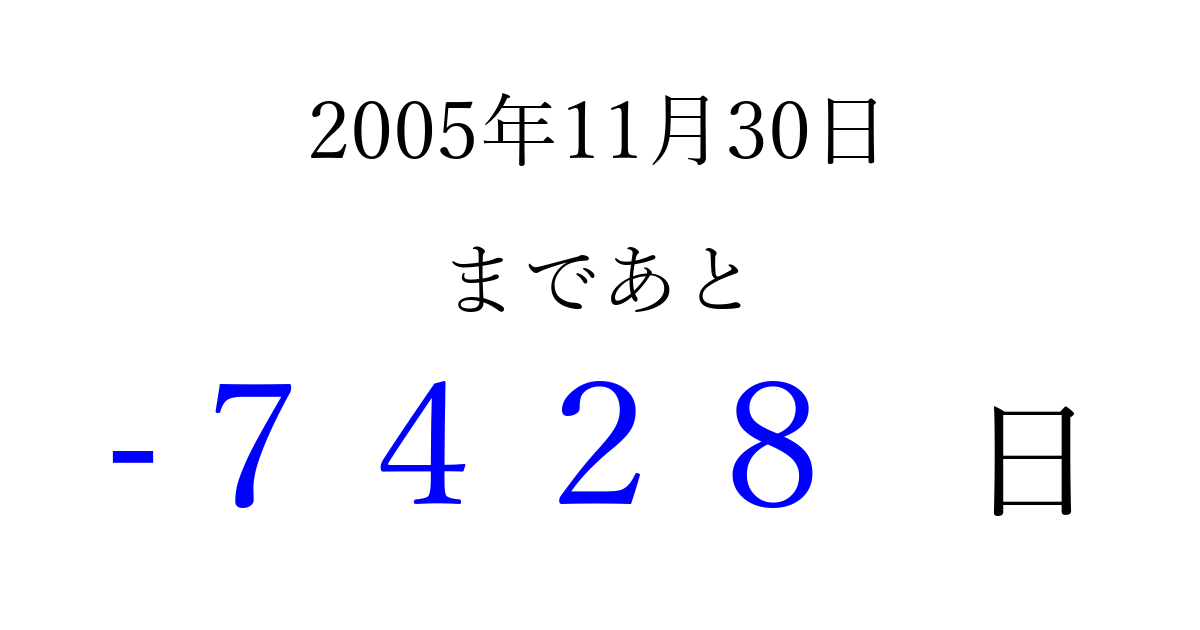 2005年11月30日(水)は もう 0000 日過ぎました 追加すると、トップページからすぐ選べるようになります ※2026/04/02現在の結果です。 最新の状態に更新する ↓シェアして、タイムライン上にカウントダウンを表示しよう!↓ 📤 この結果を共有する Tweet シェア Threads Bluesky 別の日付でカウントダウン 2005年11月のカレンダー このページをブックマークに追加すると、いつでもカウントダウンを確認できます。 (PC: Ctrl+D / Mac: ⌘+D) hitome-notes.comでは以下のページも運営しています。 指定日と期間から日付を計算 | ガチャ確率計算・シミュレーション | プライバシー・ポリシー 運営者:Avocado