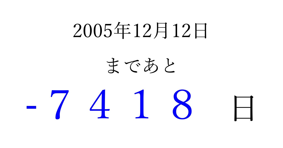 2005年12月12日(月)は もう 0000 日過ぎました 追加すると、トップページからすぐ選べるようになります ※2026/04/04現在の結果です。 最新の状態に更新する ↓シェアして、タイムライン上にカウントダウンを表示しよう!↓ 📤 この結果を共有する Tweet シェア Threads Bluesky 別の日付でカウントダウン 2005年12月のカレンダー このページをブックマークに追加すると、いつでもカウントダウンを確認できます。 (PC: Ctrl+D / Mac: ⌘+D) hitome-notes.comでは以下のページも運営しています。 指定日と期間から日付を計算 | ガチャ確率計算・シミュレーション | プライバシー・ポリシー 運営者:Avocado