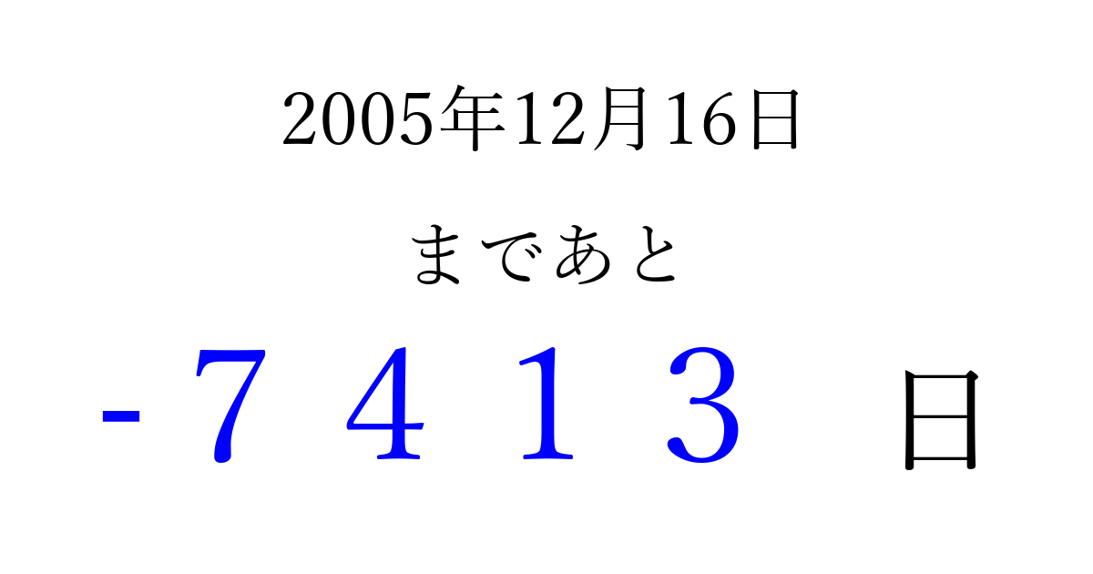 2005年12月16日(金)は もう 0000 日過ぎました 追加すると、トップページからすぐ選べるようになります ※2026/04/03現在の結果です。 最新の状態に更新する ↓シェアして、タイムライン上にカウントダウンを表示しよう!↓ 📤 この結果を共有する Tweet シェア Threads Bluesky 別の日付でカウントダウン 2005年12月のカレンダー このページをブックマークに追加すると、いつでもカウントダウンを確認できます。 (PC: Ctrl+D / Mac: ⌘+D) hitome-notes.comでは以下のページも運営しています。 指定日と期間から日付を計算 | ガチャ確率計算・シミュレーション | プライバシー・ポリシー 運営者:Avocado