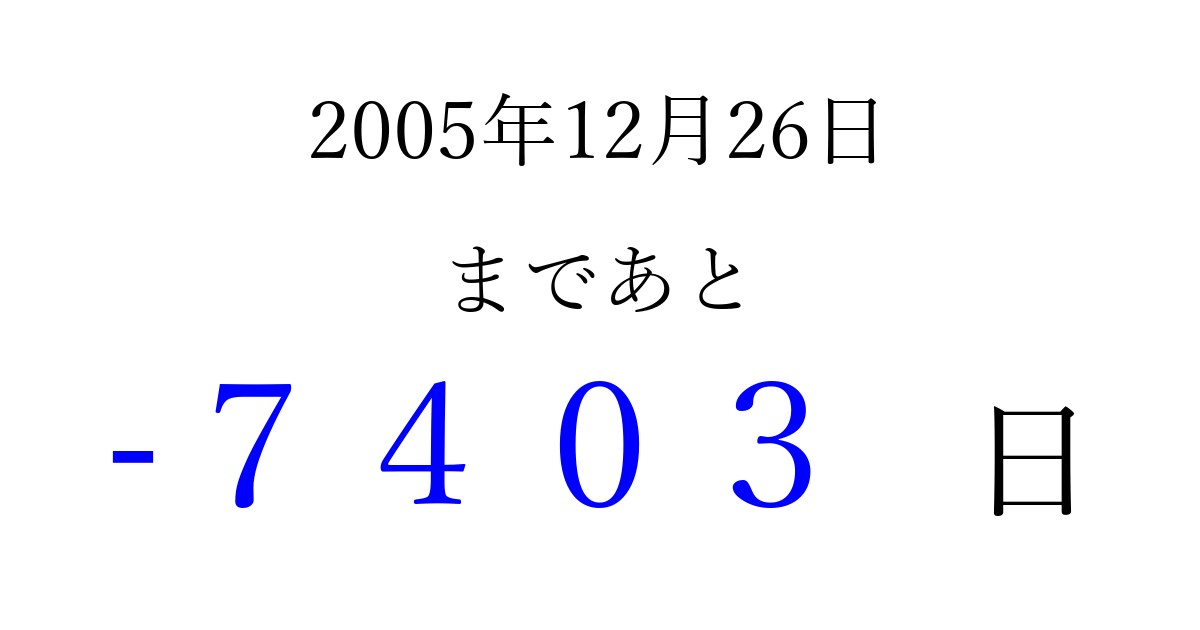 2005年12月26日(月)は もう 0000 日過ぎました 追加すると、トップページからすぐ選べるようになります ※2026/04/03現在の結果です。 最新の状態に更新する ↓シェアして、タイムライン上にカウントダウンを表示しよう!↓ 📤 この結果を共有する Tweet シェア Threads Bluesky 別の日付でカウントダウン 2005年12月のカレンダー このページをブックマークに追加すると、いつでもカウントダウンを確認できます。 (PC: Ctrl+D / Mac: ⌘+D) hitome-notes.comでは以下のページも運営しています。 指定日と期間から日付を計算 | ガチャ確率計算・シミュレーション | プライバシー・ポリシー 運営者:Avocado