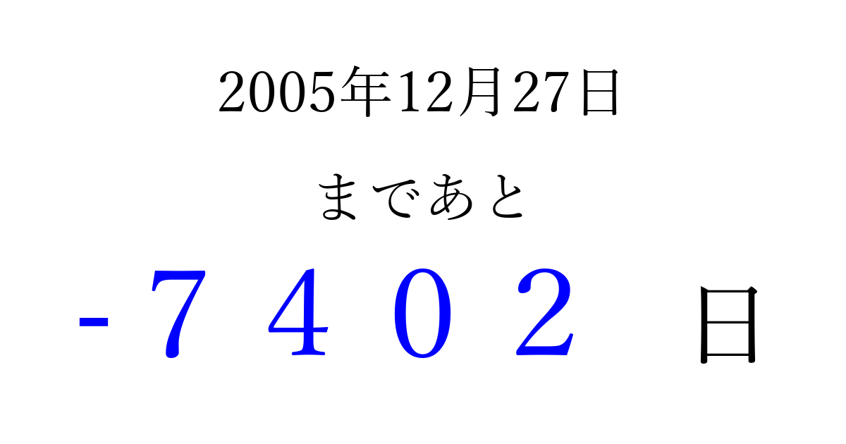2005年12月27日(火)は もう 0000 日過ぎました 追加すると、トップページからすぐ選べるようになります ※2026/04/03現在の結果です。 最新の状態に更新する ↓シェアして、タイムライン上にカウントダウンを表示しよう!↓ 📤 この結果を共有する Tweet シェア Threads Bluesky 別の日付でカウントダウン 2005年12月のカレンダー このページをブックマークに追加すると、いつでもカウントダウンを確認できます。 (PC: Ctrl+D / Mac: ⌘+D) hitome-notes.comでは以下のページも運営しています。 指定日と期間から日付を計算 | ガチャ確率計算・シミュレーション | プライバシー・ポリシー 運営者:Avocado