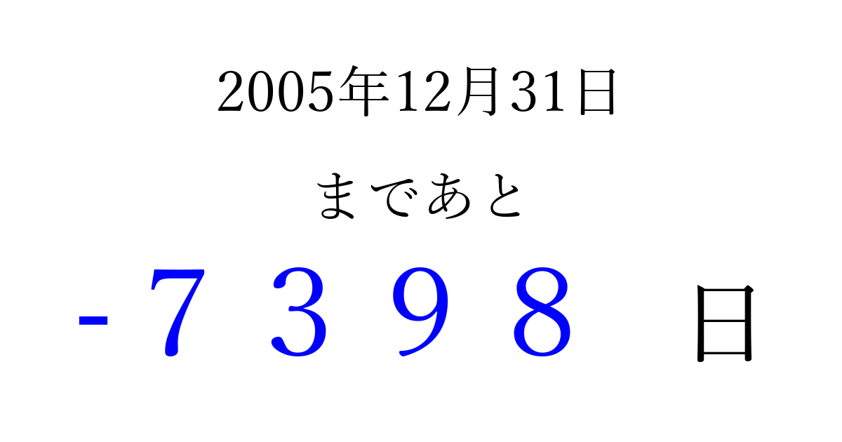 2005年12月31日(土)は もう 0000 日過ぎました 追加すると、トップページからすぐ選べるようになります ※2026/04/03現在の結果です。 最新の状態に更新する ↓シェアして、タイムライン上にカウントダウンを表示しよう!↓ 📤 この結果を共有する Tweet シェア Threads Bluesky 別の日付でカウントダウン 2005年12月のカレンダー このページをブックマークに追加すると、いつでもカウントダウンを確認できます。 (PC: Ctrl+D / Mac: ⌘+D) hitome-notes.comでは以下のページも運営しています。 指定日と期間から日付を計算 | ガチャ確率計算・シミュレーション | プライバシー・ポリシー 運営者:Avocado