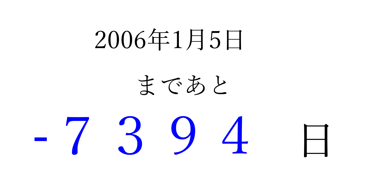2006年1月5日(木)は もう 0000 日過ぎました 追加すると、トップページからすぐ選べるようになります ※2026/04/04現在の結果です。 最新の状態に更新する ↓シェアして、タイムライン上にカウントダウンを表示しよう!↓ 📤 この結果を共有する Tweet シェア Threads Bluesky 別の日付でカウントダウン 2006年1月のカレンダー このページをブックマークに追加すると、いつでもカウントダウンを確認できます。 (PC: Ctrl+D / Mac: ⌘+D) hitome-notes.comでは以下のページも運営しています。 指定日と期間から日付を計算 | ガチャ確率計算・シミュレーション | プライバシー・ポリシー 運営者:Avocado