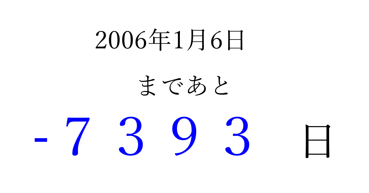 2006年1月6日(金)は もう 0000 日過ぎました 追加すると、トップページからすぐ選べるようになります ※2026/04/04現在の結果です。 最新の状態に更新する ↓シェアして、タイムライン上にカウントダウンを表示しよう!↓ 📤 この結果を共有する Tweet シェア Threads Bluesky 別の日付でカウントダウン 2006年1月のカレンダー このページをブックマークに追加すると、いつでもカウントダウンを確認できます。 (PC: Ctrl+D / Mac: ⌘+D) hitome-notes.comでは以下のページも運営しています。 指定日と期間から日付を計算 | ガチャ確率計算・シミュレーション | プライバシー・ポリシー 運営者:Avocado