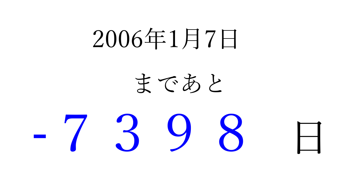 2006年1月7日(土)は もう 0000 日過ぎました 追加すると、トップページからすぐ選べるようになります ※2026/04/10現在の結果です。 最新の状態に更新する ↓シェアして、タイムライン上にカウントダウンを表示しよう!↓ 📤 この結果を共有する Tweet シェア Threads Bluesky 別の日付でカウントダウン 2006年1月のカレンダー このページをブックマークに追加すると、いつでもカウントダウンを確認できます。 (PC: Ctrl+D / Mac: ⌘+D) hitome-notes.comでは以下のページも運営しています。 指定日と期間から日付を計算 | ガチャ確率計算・シミュレーション | プライバシー・ポリシー 運営者:Avocado
