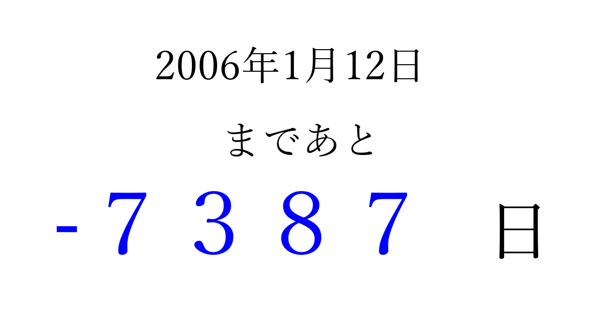 2006年1月12日(木)は もう 0000 日過ぎました 追加すると、トップページからすぐ選べるようになります ※2026/04/04現在の結果です。 最新の状態に更新する ↓シェアして、タイムライン上にカウントダウンを表示しよう!↓ 📤 この結果を共有する Tweet シェア Threads Bluesky 別の日付でカウントダウン 2006年1月のカレンダー このページをブックマークに追加すると、いつでもカウントダウンを確認できます。 (PC: Ctrl+D / Mac: ⌘+D) hitome-notes.comでは以下のページも運営しています。 指定日と期間から日付を計算 | ガチャ確率計算・シミュレーション | プライバシー・ポリシー 運営者:Avocado