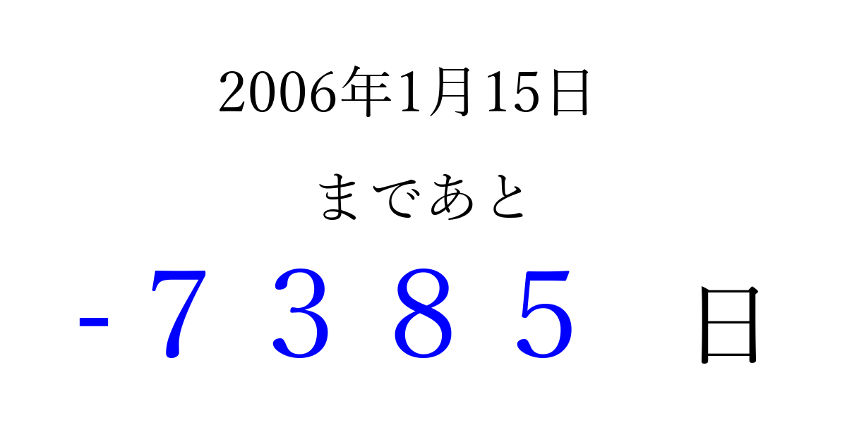 2006年1月15日(日)は もう 0000 日過ぎました 追加すると、トップページからすぐ選べるようになります ※2026/04/05現在の結果です。 最新の状態に更新する ↓シェアして、タイムライン上にカウントダウンを表示しよう!↓ 📤 この結果を共有する Tweet シェア Threads Bluesky 別の日付でカウントダウン 2006年1月のカレンダー このページをブックマークに追加すると、いつでもカウントダウンを確認できます。 (PC: Ctrl+D / Mac: ⌘+D) hitome-notes.comでは以下のページも運営しています。 指定日と期間から日付を計算 | ガチャ確率計算・シミュレーション | プライバシー・ポリシー 運営者:Avocado