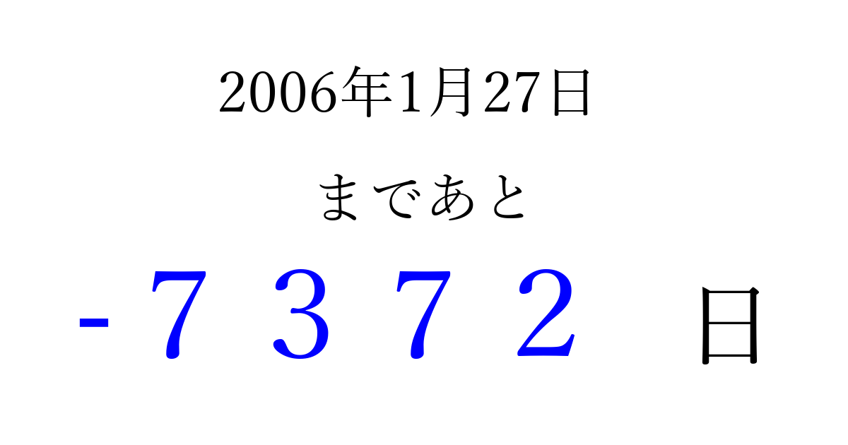 2006年1月27日(金)は もう 0000 日過ぎました 追加すると、トップページからすぐ選べるようになります ※2026/04/04現在の結果です。 最新の状態に更新する ↓シェアして、タイムライン上にカウントダウンを表示しよう!↓ 📤 この結果を共有する Tweet シェア Threads Bluesky 別の日付でカウントダウン 2006年1月のカレンダー このページをブックマークに追加すると、いつでもカウントダウンを確認できます。 (PC: Ctrl+D / Mac: ⌘+D) hitome-notes.comでは以下のページも運営しています。 指定日と期間から日付を計算 | ガチャ確率計算・シミュレーション | プライバシー・ポリシー 運営者:Avocado
