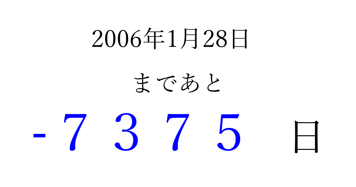 2006年1月28日(土)は もう 0000 日過ぎました 追加すると、トップページからすぐ選べるようになります ※2026/04/08現在の結果です。 最新の状態に更新する ↓シェアして、タイムライン上にカウントダウンを表示しよう!↓ 📤 この結果を共有する Tweet シェア Threads Bluesky 別の日付でカウントダウン 2006年1月のカレンダー このページをブックマークに追加すると、いつでもカウントダウンを確認できます。 (PC: Ctrl+D / Mac: ⌘+D) hitome-notes.comでは以下のページも運営しています。 指定日と期間から日付を計算 | ガチャ確率計算・シミュレーション | プライバシー・ポリシー 運営者:Avocado