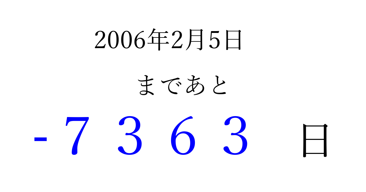 2006年2月5日(日)は もう 0000 日過ぎました 追加すると、トップページからすぐ選べるようになります ※2026/04/04現在の結果です。 最新の状態に更新する ↓シェアして、タイムライン上にカウントダウンを表示しよう!↓ 📤 この結果を共有する Tweet シェア Threads Bluesky 別の日付でカウントダウン 2006年2月のカレンダー このページをブックマークに追加すると、いつでもカウントダウンを確認できます。 (PC: Ctrl+D / Mac: ⌘+D) hitome-notes.comでは以下のページも運営しています。 指定日と期間から日付を計算 | ガチャ確率計算・シミュレーション | プライバシー・ポリシー 運営者:Avocado