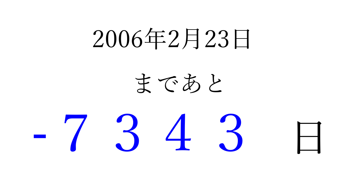 2006年2月23日(木)は もう 0000 日過ぎました 追加すると、トップページからすぐ選べるようになります ※2026/04/02現在の結果です。 最新の状態に更新する ↓シェアして、タイムライン上にカウントダウンを表示しよう!↓ 📤 この結果を共有する Tweet シェア Threads Bluesky 別の日付でカウントダウン 2006年2月のカレンダー このページをブックマークに追加すると、いつでもカウントダウンを確認できます。 (PC: Ctrl+D / Mac: ⌘+D) hitome-notes.comでは以下のページも運営しています。 指定日と期間から日付を計算 | ガチャ確率計算・シミュレーション | プライバシー・ポリシー 運営者:Avocado