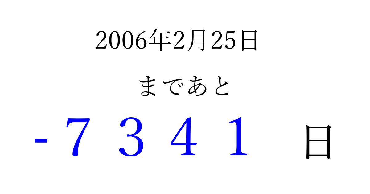 2006年2月25日(土)は もう 0000 日過ぎました 追加すると、トップページからすぐ選べるようになります ※2026/04/02現在の結果です。 最新の状態に更新する ↓シェアして、タイムライン上にカウントダウンを表示しよう!↓ 📤 この結果を共有する Tweet シェア Threads Bluesky 別の日付でカウントダウン 2006年2月のカレンダー このページをブックマークに追加すると、いつでもカウントダウンを確認できます。 (PC: Ctrl+D / Mac: ⌘+D) hitome-notes.comでは以下のページも運営しています。 指定日と期間から日付を計算 | ガチャ確率計算・シミュレーション | プライバシー・ポリシー 運営者:Avocado
