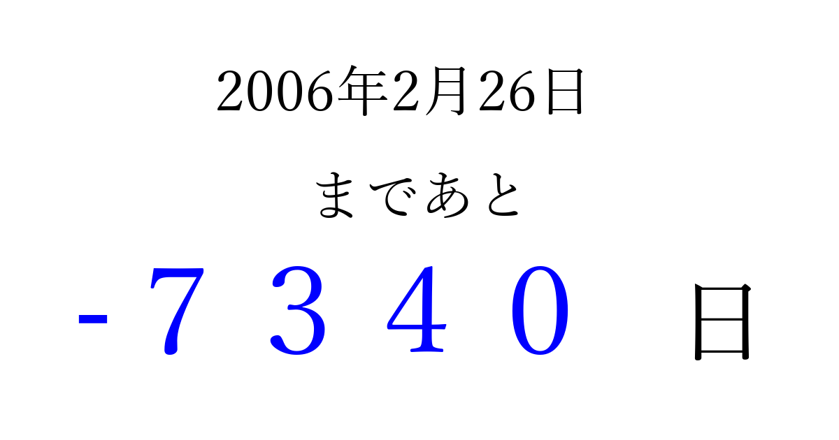 2006年2月26日(日)は もう 0000 日過ぎました 追加すると、トップページからすぐ選べるようになります ※2026/04/02現在の結果です。 最新の状態に更新する ↓シェアして、タイムライン上にカウントダウンを表示しよう!↓ 📤 この結果を共有する Tweet シェア Threads Bluesky 別の日付でカウントダウン 2006年2月のカレンダー このページをブックマークに追加すると、いつでもカウントダウンを確認できます。 (PC: Ctrl+D / Mac: ⌘+D) hitome-notes.comでは以下のページも運営しています。 指定日と期間から日付を計算 | ガチャ確率計算・シミュレーション | プライバシー・ポリシー 運営者:Avocado