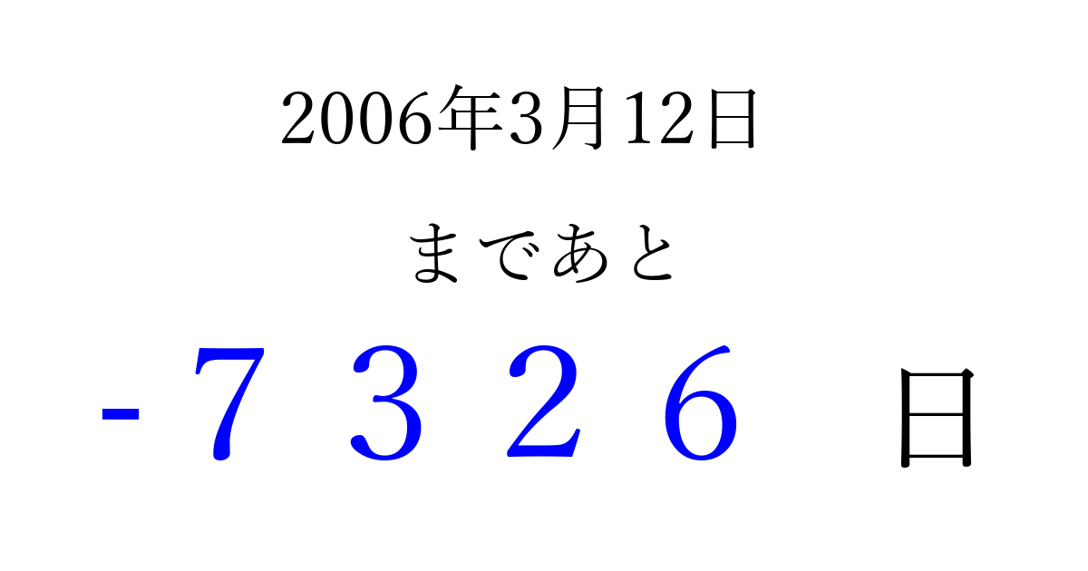 2006年3月12日(日)は もう 0000 日過ぎました 追加すると、トップページからすぐ選べるようになります ※2026/04/02現在の結果です。 最新の状態に更新する ↓シェアして、タイムライン上にカウントダウンを表示しよう!↓ 📤 この結果を共有する Tweet シェア Threads Bluesky 別の日付でカウントダウン 2006年3月のカレンダー このページをブックマークに追加すると、いつでもカウントダウンを確認できます。 (PC: Ctrl+D / Mac: ⌘+D) hitome-notes.comでは以下のページも運営しています。 指定日と期間から日付を計算 | ガチャ確率計算・シミュレーション | プライバシー・ポリシー 運営者:Avocado