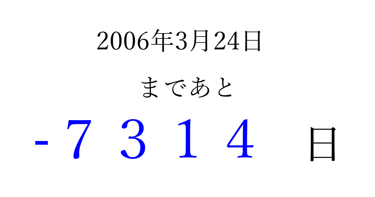 2006年3月24日(金)は もう 0000 日過ぎました 追加すると、トップページからすぐ選べるようになります ※2026/04/02現在の結果です。 最新の状態に更新する ↓シェアして、タイムライン上にカウントダウンを表示しよう!↓ 📤 この結果を共有する Tweet シェア Threads Bluesky 別の日付でカウントダウン 2006年3月のカレンダー このページをブックマークに追加すると、いつでもカウントダウンを確認できます。 (PC: Ctrl+D / Mac: ⌘+D) hitome-notes.comでは以下のページも運営しています。 指定日と期間から日付を計算 | ガチャ確率計算・シミュレーション | プライバシー・ポリシー 運営者:Avocado