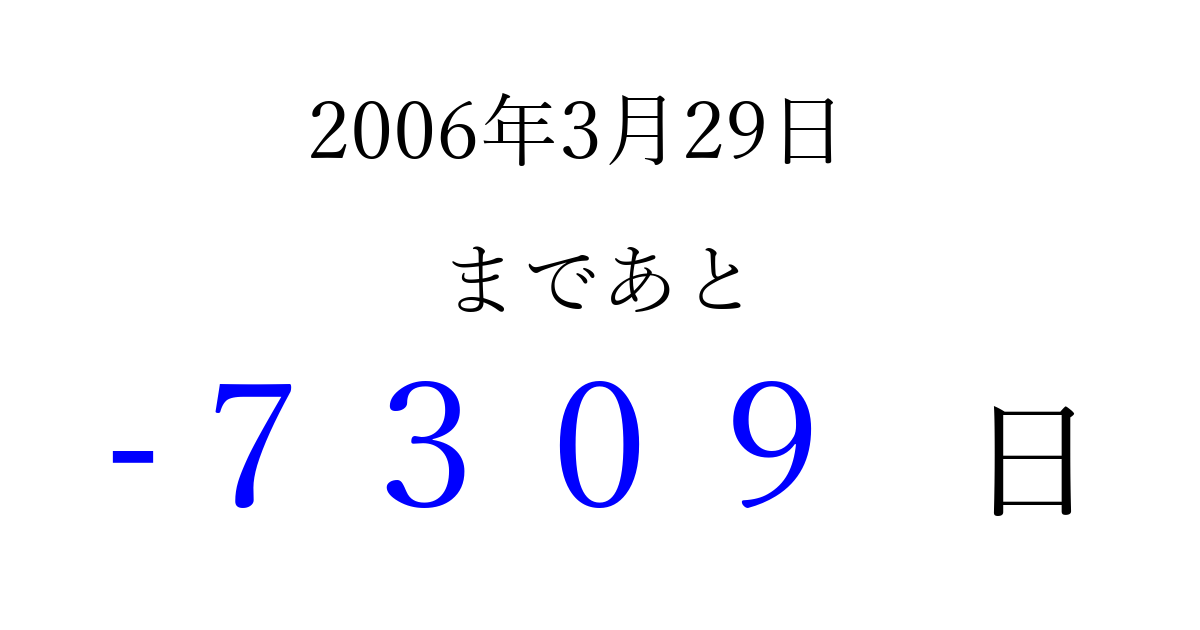 2006年3月29日(水)は もう 0000 日過ぎました 追加すると、トップページからすぐ選べるようになります ※2026/04/02現在の結果です。 最新の状態に更新する ↓シェアして、タイムライン上にカウントダウンを表示しよう!↓ 📤 この結果を共有する Tweet シェア Threads Bluesky 別の日付でカウントダウン 2006年3月のカレンダー このページをブックマークに追加すると、いつでもカウントダウンを確認できます。 (PC: Ctrl+D / Mac: ⌘+D) hitome-notes.comでは以下のページも運営しています。 指定日と期間から日付を計算 | ガチャ確率計算・シミュレーション | プライバシー・ポリシー 運営者:Avocado
