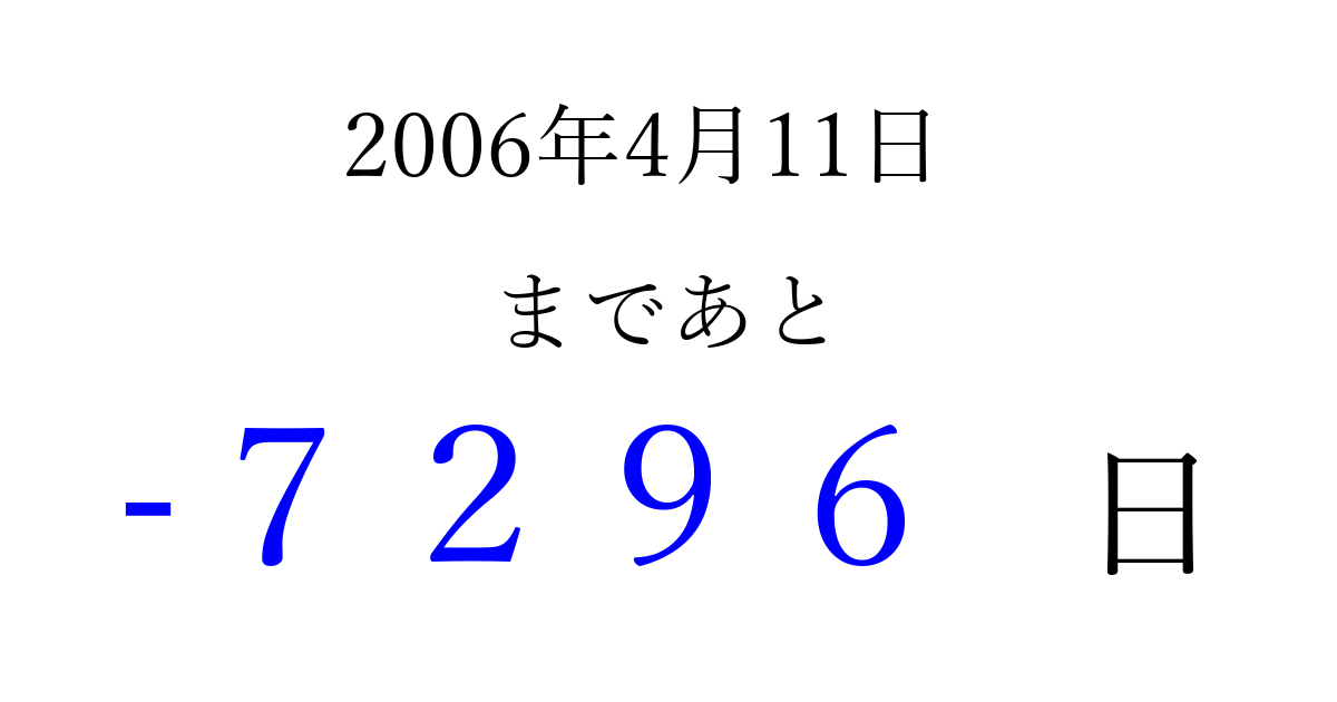 2006年4月11日(火)は もう 0000 日過ぎました 追加すると、トップページからすぐ選べるようになります ※2026/04/02現在の結果です。 最新の状態に更新する ↓シェアして、タイムライン上にカウントダウンを表示しよう!↓ 📤 この結果を共有する Tweet シェア Threads Bluesky 別の日付でカウントダウン 2006年4月のカレンダー このページをブックマークに追加すると、いつでもカウントダウンを確認できます。 (PC: Ctrl+D / Mac: ⌘+D) hitome-notes.comでは以下のページも運営しています。 指定日と期間から日付を計算 | ガチャ確率計算・シミュレーション | プライバシー・ポリシー 運営者:Avocado