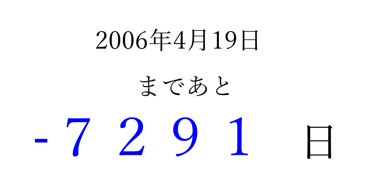 2006年4月19日(水)は もう 0000 日過ぎました 追加すると、トップページからすぐ選べるようになります ※2026/04/05現在の結果です。 最新の状態に更新する ↓シェアして、タイムライン上にカウントダウンを表示しよう!↓ 📤 この結果を共有する Tweet シェア Threads Bluesky 別の日付でカウントダウン 2006年4月のカレンダー このページをブックマークに追加すると、いつでもカウントダウンを確認できます。 (PC: Ctrl+D / Mac: ⌘+D) hitome-notes.comでは以下のページも運営しています。 指定日と期間から日付を計算 | ガチャ確率計算・シミュレーション | プライバシー・ポリシー 運営者:Avocado