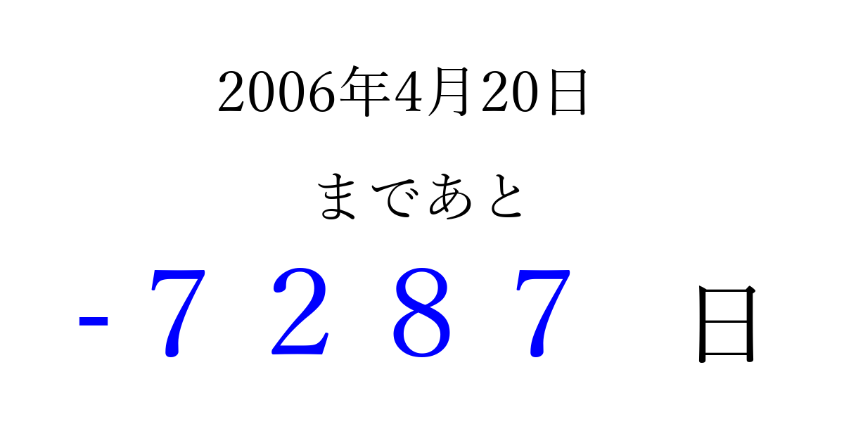 2006年4月20日(木)は もう 0000 日過ぎました 追加すると、トップページからすぐ選べるようになります ※2026/04/02現在の結果です。 最新の状態に更新する ↓シェアして、タイムライン上にカウントダウンを表示しよう!↓ 📤 この結果を共有する Tweet シェア Threads Bluesky 別の日付でカウントダウン 2006年4月のカレンダー このページをブックマークに追加すると、いつでもカウントダウンを確認できます。 (PC: Ctrl+D / Mac: ⌘+D) hitome-notes.comでは以下のページも運営しています。 指定日と期間から日付を計算 | ガチャ確率計算・シミュレーション | プライバシー・ポリシー 運営者:Avocado