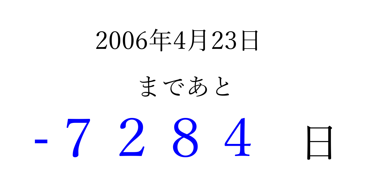 2006年4月23日(日)は もう 0000 日過ぎました 追加すると、トップページからすぐ選べるようになります ※2026/04/02現在の結果です。 最新の状態に更新する ↓シェアして、タイムライン上にカウントダウンを表示しよう!↓ 📤 この結果を共有する Tweet シェア Threads Bluesky 別の日付でカウントダウン 2006年4月のカレンダー このページをブックマークに追加すると、いつでもカウントダウンを確認できます。 (PC: Ctrl+D / Mac: ⌘+D) hitome-notes.comでは以下のページも運営しています。 指定日と期間から日付を計算 | ガチャ確率計算・シミュレーション | プライバシー・ポリシー 運営者:Avocado