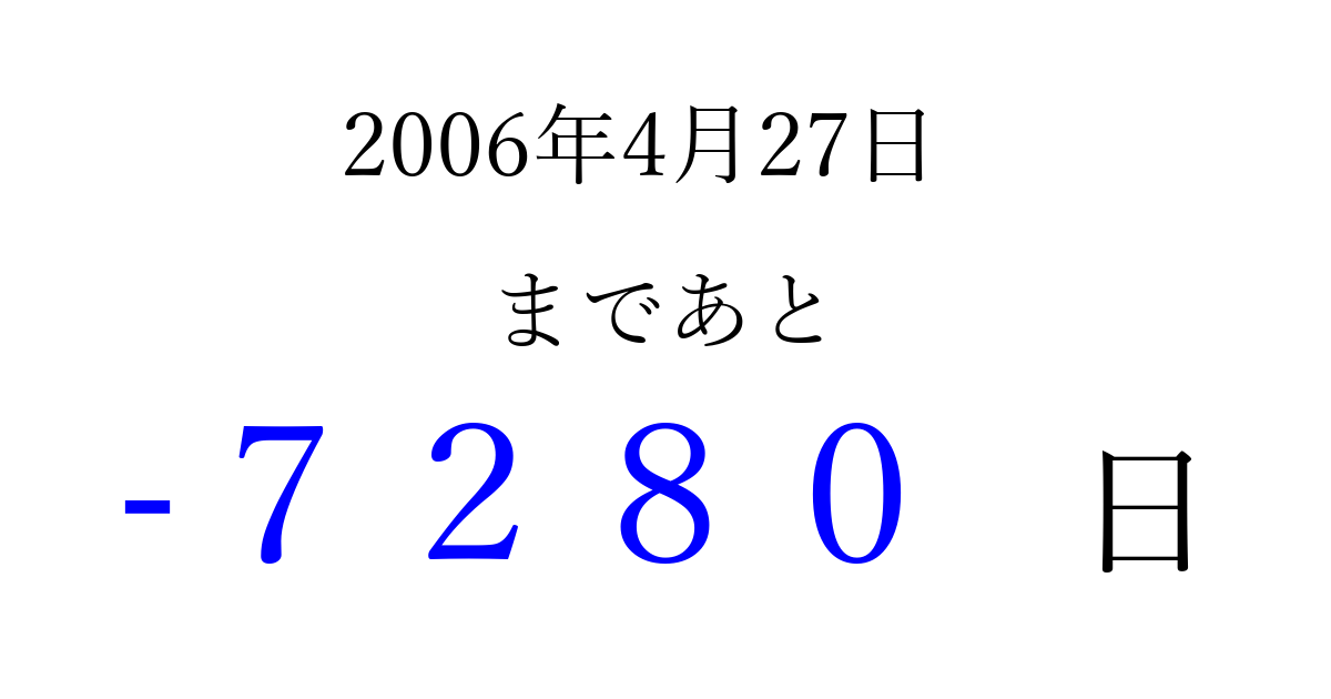 2006年4月27日(木)は もう 0000 日過ぎました 追加すると、トップページからすぐ選べるようになります ※2026/04/02現在の結果です。 最新の状態に更新する ↓シェアして、タイムライン上にカウントダウンを表示しよう!↓ 📤 この結果を共有する Tweet シェア Threads Bluesky 別の日付でカウントダウン 2006年4月のカレンダー このページをブックマークに追加すると、いつでもカウントダウンを確認できます。 (PC: Ctrl+D / Mac: ⌘+D) hitome-notes.comでは以下のページも運営しています。 指定日と期間から日付を計算 | ガチャ確率計算・シミュレーション | プライバシー・ポリシー 運営者:Avocado