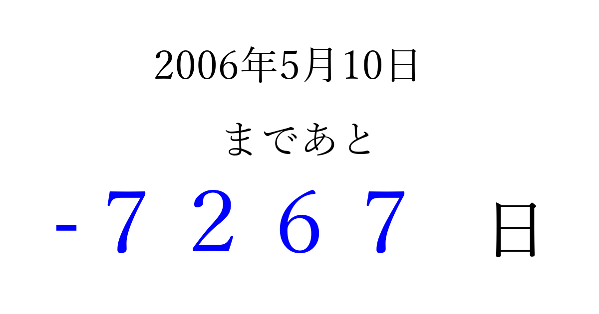 2006年5月10日(水)は もう 0000 日過ぎました 追加すると、トップページからすぐ選べるようになります ※2026/04/02現在の結果です。 最新の状態に更新する ↓シェアして、タイムライン上にカウントダウンを表示しよう!↓ 📤 この結果を共有する Tweet シェア Threads Bluesky 別の日付でカウントダウン 2006年5月のカレンダー このページをブックマークに追加すると、いつでもカウントダウンを確認できます。 (PC: Ctrl+D / Mac: ⌘+D) hitome-notes.comでは以下のページも運営しています。 指定日と期間から日付を計算 | ガチャ確率計算・シミュレーション | プライバシー・ポリシー 運営者:Avocado