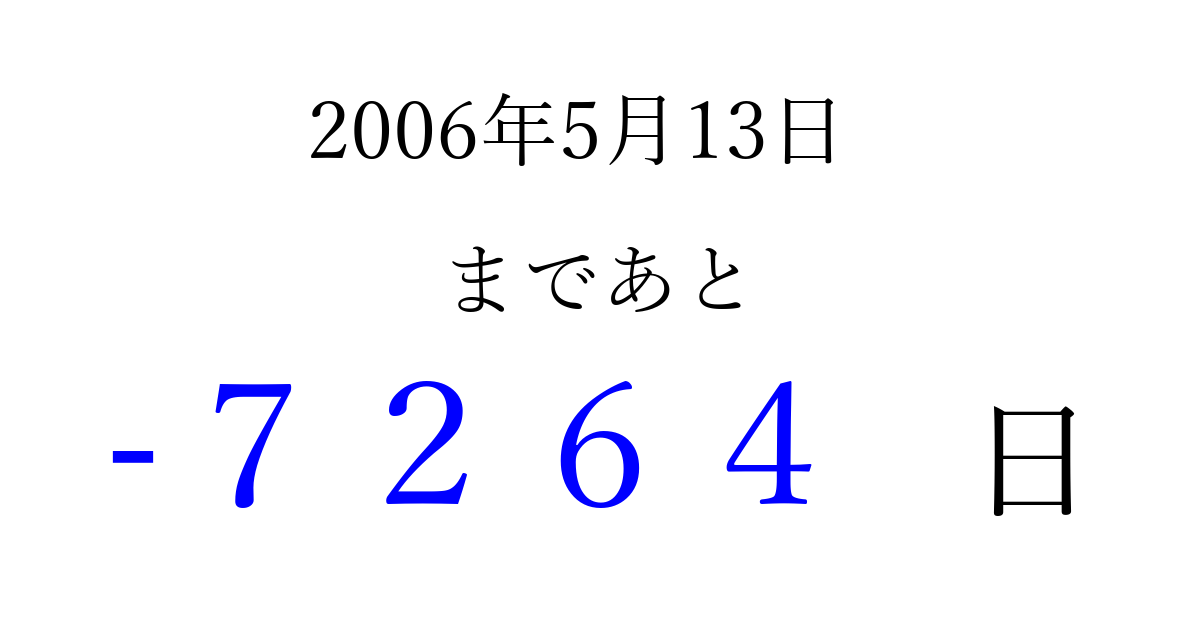 2006年5月13日(土)は もう 0000 日過ぎました 追加すると、トップページからすぐ選べるようになります ※2026/04/02現在の結果です。 最新の状態に更新する ↓シェアして、タイムライン上にカウントダウンを表示しよう!↓ 📤 この結果を共有する Tweet シェア Threads Bluesky 別の日付でカウントダウン 2006年5月のカレンダー このページをブックマークに追加すると、いつでもカウントダウンを確認できます。 (PC: Ctrl+D / Mac: ⌘+D) hitome-notes.comでは以下のページも運営しています。 指定日と期間から日付を計算 | ガチャ確率計算・シミュレーション | プライバシー・ポリシー 運営者:Avocado