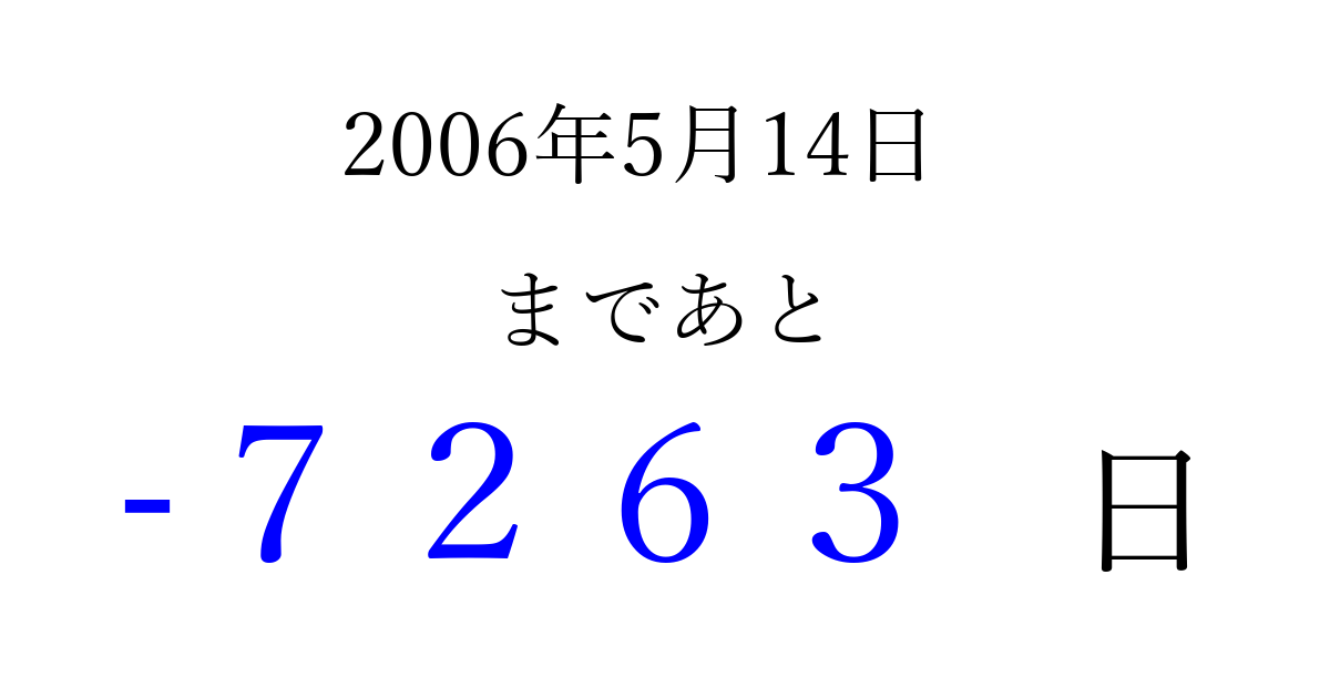 2006年5月14日(日)は もう 0000 日過ぎました 追加すると、トップページからすぐ選べるようになります ※2026/04/02現在の結果です。 最新の状態に更新する ↓シェアして、タイムライン上にカウントダウンを表示しよう!↓ 📤 この結果を共有する Tweet シェア Threads Bluesky 別の日付でカウントダウン 2006年5月のカレンダー このページをブックマークに追加すると、いつでもカウントダウンを確認できます。 (PC: Ctrl+D / Mac: ⌘+D) hitome-notes.comでは以下のページも運営しています。 指定日と期間から日付を計算 | ガチャ確率計算・シミュレーション | プライバシー・ポリシー 運営者:Avocado
