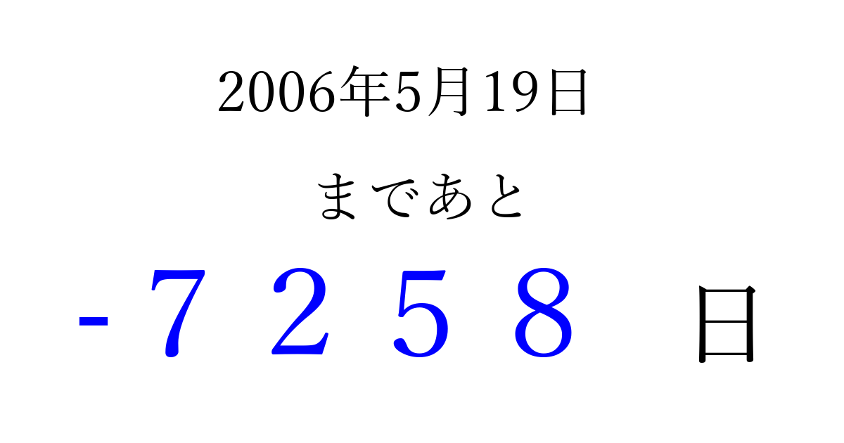 2006年5月19日(金)は もう 0000 日過ぎました 追加すると、トップページからすぐ選べるようになります ※2026/04/02現在の結果です。 最新の状態に更新する ↓シェアして、タイムライン上にカウントダウンを表示しよう!↓ 📤 この結果を共有する Tweet シェア Threads Bluesky 別の日付でカウントダウン 2006年5月のカレンダー このページをブックマークに追加すると、いつでもカウントダウンを確認できます。 (PC: Ctrl+D / Mac: ⌘+D) hitome-notes.comでは以下のページも運営しています。 指定日と期間から日付を計算 | ガチャ確率計算・シミュレーション | プライバシー・ポリシー 運営者:Avocado