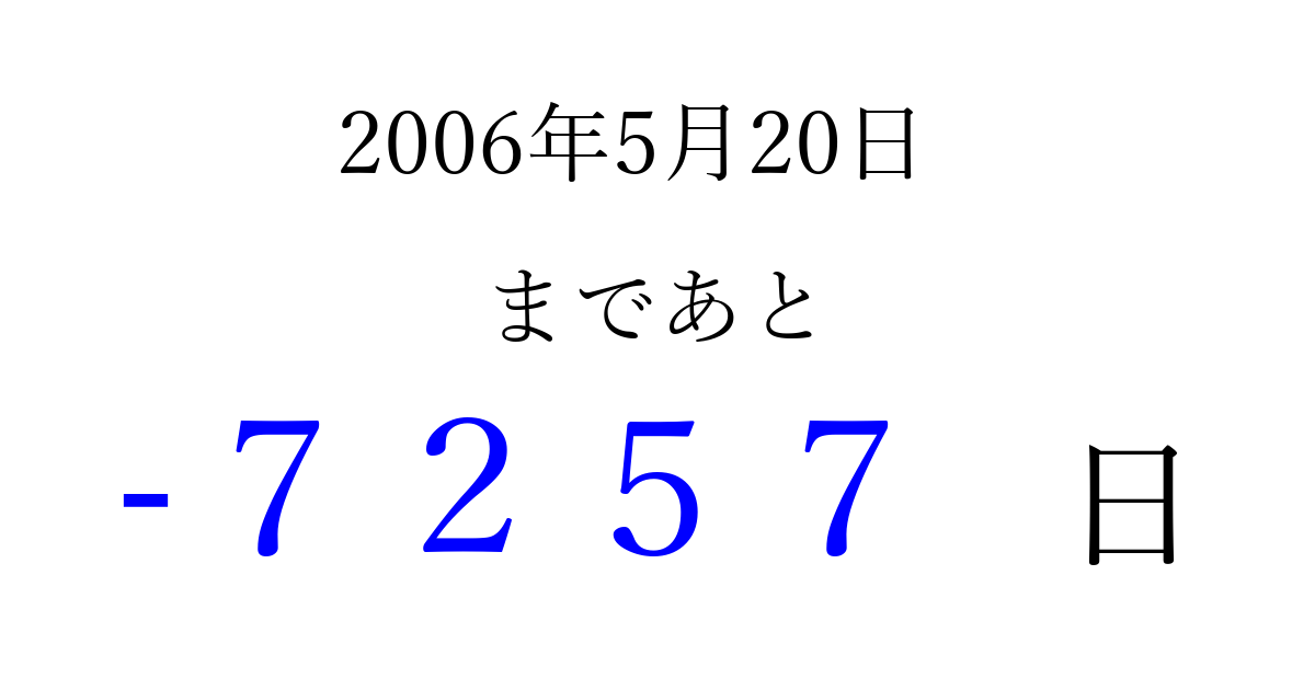 2006年5月20日(土)は もう 0000 日過ぎました 追加すると、トップページからすぐ選べるようになります ※2026/04/02現在の結果です。 最新の状態に更新する ↓シェアして、タイムライン上にカウントダウンを表示しよう!↓ 📤 この結果を共有する Tweet シェア Threads Bluesky 別の日付でカウントダウン 2006年5月のカレンダー このページをブックマークに追加すると、いつでもカウントダウンを確認できます。 (PC: Ctrl+D / Mac: ⌘+D) hitome-notes.comでは以下のページも運営しています。 指定日と期間から日付を計算 | ガチャ確率計算・シミュレーション | プライバシー・ポリシー 運営者:Avocado