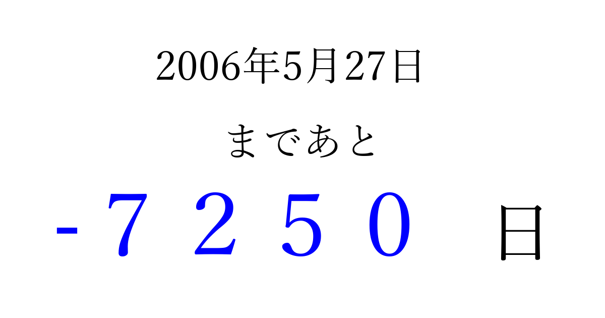 2006年5月27日(土)は もう 0000 日過ぎました 追加すると、トップページからすぐ選べるようになります ※2026/04/02現在の結果です。 最新の状態に更新する ↓シェアして、タイムライン上にカウントダウンを表示しよう!↓ 📤 この結果を共有する Tweet シェア Threads Bluesky 別の日付でカウントダウン 2006年5月のカレンダー このページをブックマークに追加すると、いつでもカウントダウンを確認できます。 (PC: Ctrl+D / Mac: ⌘+D) hitome-notes.comでは以下のページも運営しています。 指定日と期間から日付を計算 | ガチャ確率計算・シミュレーション | プライバシー・ポリシー 運営者:Avocado