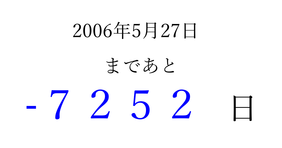 2006年5月27日(土)は もう 0000 日過ぎました 追加すると、トップページからすぐ選べるようになります ※2026/04/04現在の結果です。 最新の状態に更新する ↓シェアして、タイムライン上にカウントダウンを表示しよう!↓ 📤 この結果を共有する Tweet シェア Threads Bluesky 別の日付でカウントダウン 2006年5月のカレンダー このページをブックマークに追加すると、いつでもカウントダウンを確認できます。 (PC: Ctrl+D / Mac: ⌘+D) hitome-notes.comでは以下のページも運営しています。 指定日と期間から日付を計算 | ガチャ確率計算・シミュレーション | プライバシー・ポリシー 運営者:Avocado