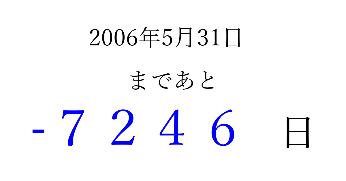 2006年5月31日(水)は もう 0000 日過ぎました 追加すると、トップページからすぐ選べるようになります ※2026/04/02現在の結果です。 最新の状態に更新する ↓シェアして、タイムライン上にカウントダウンを表示しよう!↓ 📤 この結果を共有する Tweet シェア Threads Bluesky 別の日付でカウントダウン 2006年5月のカレンダー このページをブックマークに追加すると、いつでもカウントダウンを確認できます。 (PC: Ctrl+D / Mac: ⌘+D) hitome-notes.comでは以下のページも運営しています。 指定日と期間から日付を計算 | ガチャ確率計算・シミュレーション | プライバシー・ポリシー 運営者:Avocado