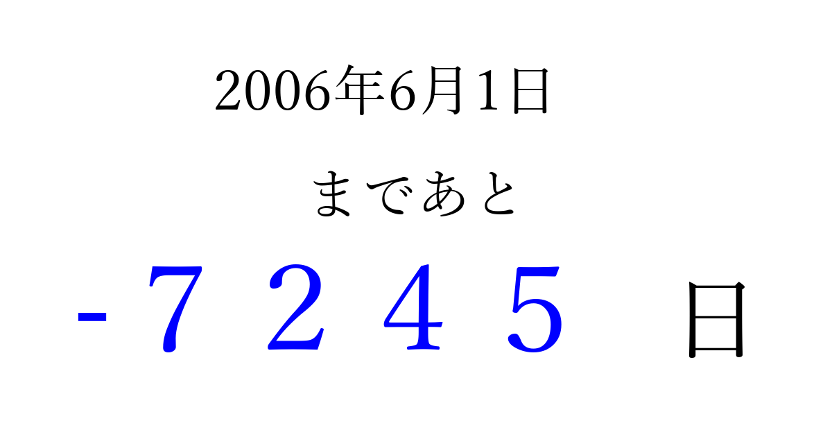 2006年6月1日(木)は もう 0000 日過ぎました 追加すると、トップページからすぐ選べるようになります ※2026/04/02現在の結果です。 最新の状態に更新する ↓シェアして、タイムライン上にカウントダウンを表示しよう!↓ 📤 この結果を共有する Tweet シェア Threads Bluesky 別の日付でカウントダウン 2006年6月のカレンダー このページをブックマークに追加すると、いつでもカウントダウンを確認できます。 (PC: Ctrl+D / Mac: ⌘+D) hitome-notes.comでは以下のページも運営しています。 指定日と期間から日付を計算 | ガチャ確率計算・シミュレーション | プライバシー・ポリシー 運営者:Avocado