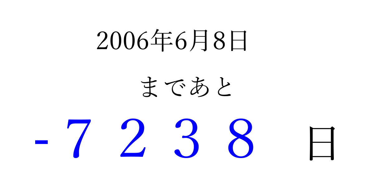 2006年6月8日(木)は もう 0000 日過ぎました 追加すると、トップページからすぐ選べるようになります ※2026/04/02現在の結果です。 最新の状態に更新する ↓シェアして、タイムライン上にカウントダウンを表示しよう!↓ 📤 この結果を共有する Tweet シェア Threads Bluesky 別の日付でカウントダウン 2006年6月のカレンダー このページをブックマークに追加すると、いつでもカウントダウンを確認できます。 (PC: Ctrl+D / Mac: ⌘+D) hitome-notes.comでは以下のページも運営しています。 指定日と期間から日付を計算 | ガチャ確率計算・シミュレーション | プライバシー・ポリシー 運営者:Avocado