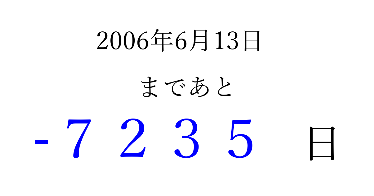 2006年6月13日(火)は もう 0000 日過ぎました 追加すると、トップページからすぐ選べるようになります ※2026/04/04現在の結果です。 最新の状態に更新する ↓シェアして、タイムライン上にカウントダウンを表示しよう!↓ 📤 この結果を共有する Tweet シェア Threads Bluesky 別の日付でカウントダウン 2006年6月のカレンダー このページをブックマークに追加すると、いつでもカウントダウンを確認できます。 (PC: Ctrl+D / Mac: ⌘+D) hitome-notes.comでは以下のページも運営しています。 指定日と期間から日付を計算 | ガチャ確率計算・シミュレーション | プライバシー・ポリシー 運営者:Avocado