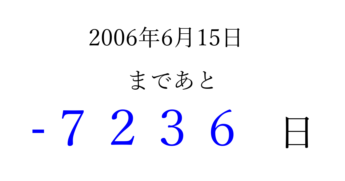 2006年6月15日(木)は もう 0000 日過ぎました 追加すると、トップページからすぐ選べるようになります ※2026/04/07現在の結果です。 最新の状態に更新する ↓シェアして、タイムライン上にカウントダウンを表示しよう!↓ 📤 この結果を共有する Tweet シェア Threads Bluesky 別の日付でカウントダウン 2006年6月のカレンダー このページをブックマークに追加すると、いつでもカウントダウンを確認できます。 (PC: Ctrl+D / Mac: ⌘+D) hitome-notes.comでは以下のページも運営しています。 指定日と期間から日付を計算 | ガチャ確率計算・シミュレーション | プライバシー・ポリシー 運営者:Avocado